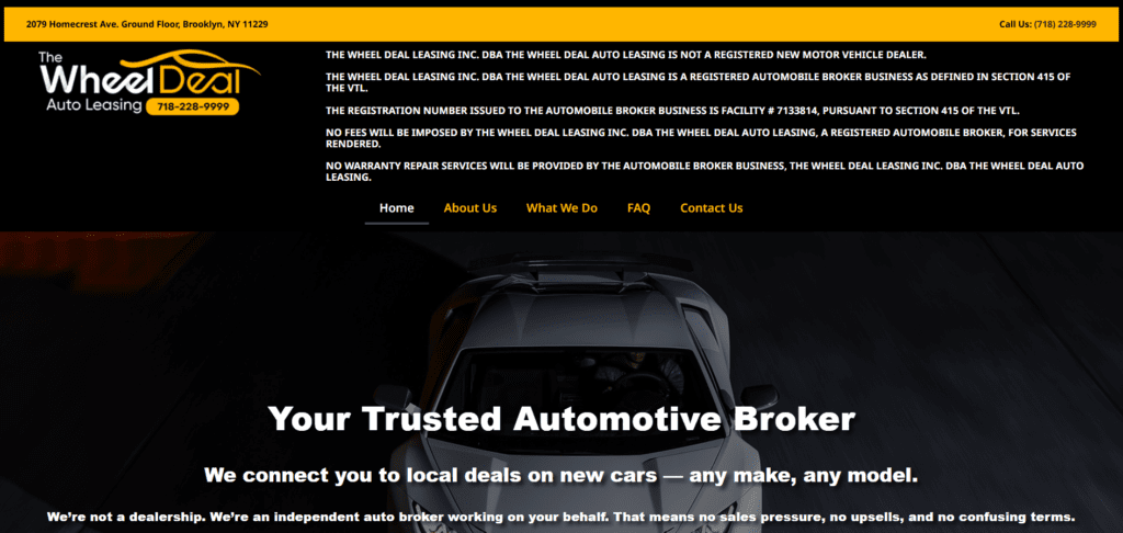 At Eight Three Eight Agency, our goal is to create digital experiences that elevate brands and drive performance. When The Wheel Deal Auto Leasing, a prominent Brooklyn-based car lease broker, approached us with the vision of revamping their online presence, we immediately saw the opportunity to help them stand out in an increasingly competitive automotive leasing market. Their existing website lacked modern design elements, was not mobile-optimized, and provided a subpar user experience that hindered lead generation. After an in-depth discovery phase, we crafted a comprehensive web design and development strategy focused on visual appeal, ease of use, and high conversion potential. Our creative team collaborated closely with The Wheel Deal’s leadership to understand their customer journey, inventory needs, and leasing services, ensuring the new site would deliver both form and function.